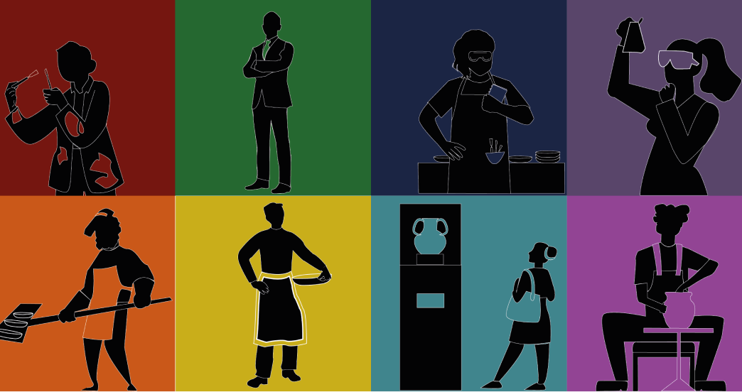 Une illustration numérique représentant plusieurs personnages travaillant dans le domaine de la céramique, mettant en avant les outils et métiers que l'on oublie.